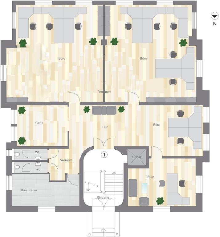 Auf über 220 Quadratmetern erstrecken sich drei separate Räume, ein großer offener Empfang/Eingang, ein Pausenraum mit Küche und ein geteilter Sanitärbereich mit Duschen und WC´s. Aktuell ist in den Räumlichkeiten eine Büroeinheit ansäßig, aufgrund der guten Raumaufteilung wären jedoch auch Vermietungen an Praxen oder Sportzentren möglich.